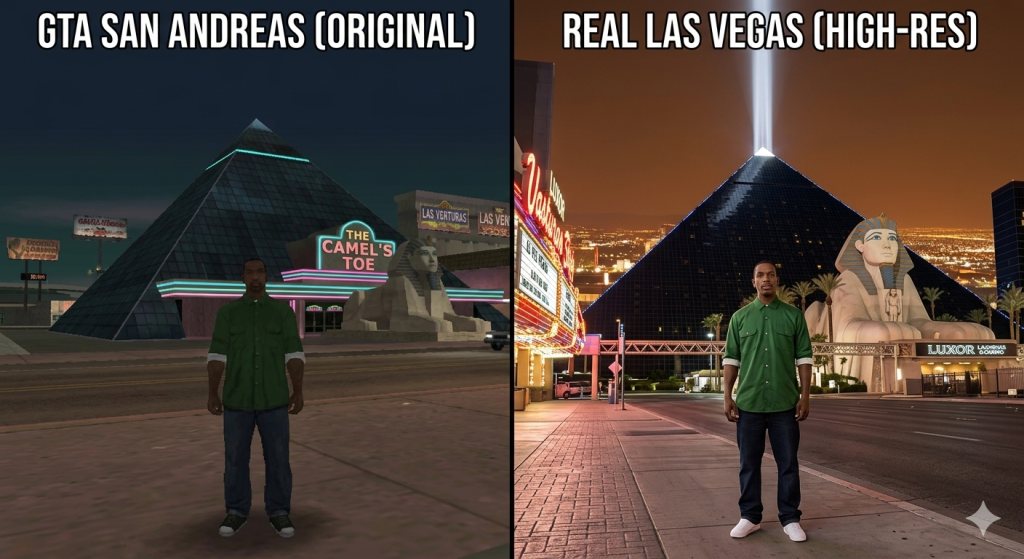 • В реальности: Это прямые копии отелей The Mirage и Luxor Las Vegas. В реальности из вершины египетской пирамиды в Вегасе тоже бьет мощный луч света в ночное небо, как и в игре.